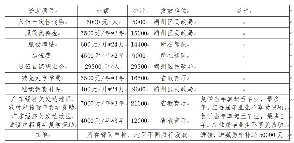 全免学费、入伍奖励、服役津贴、退伍安置、复学资助等各种经济补助